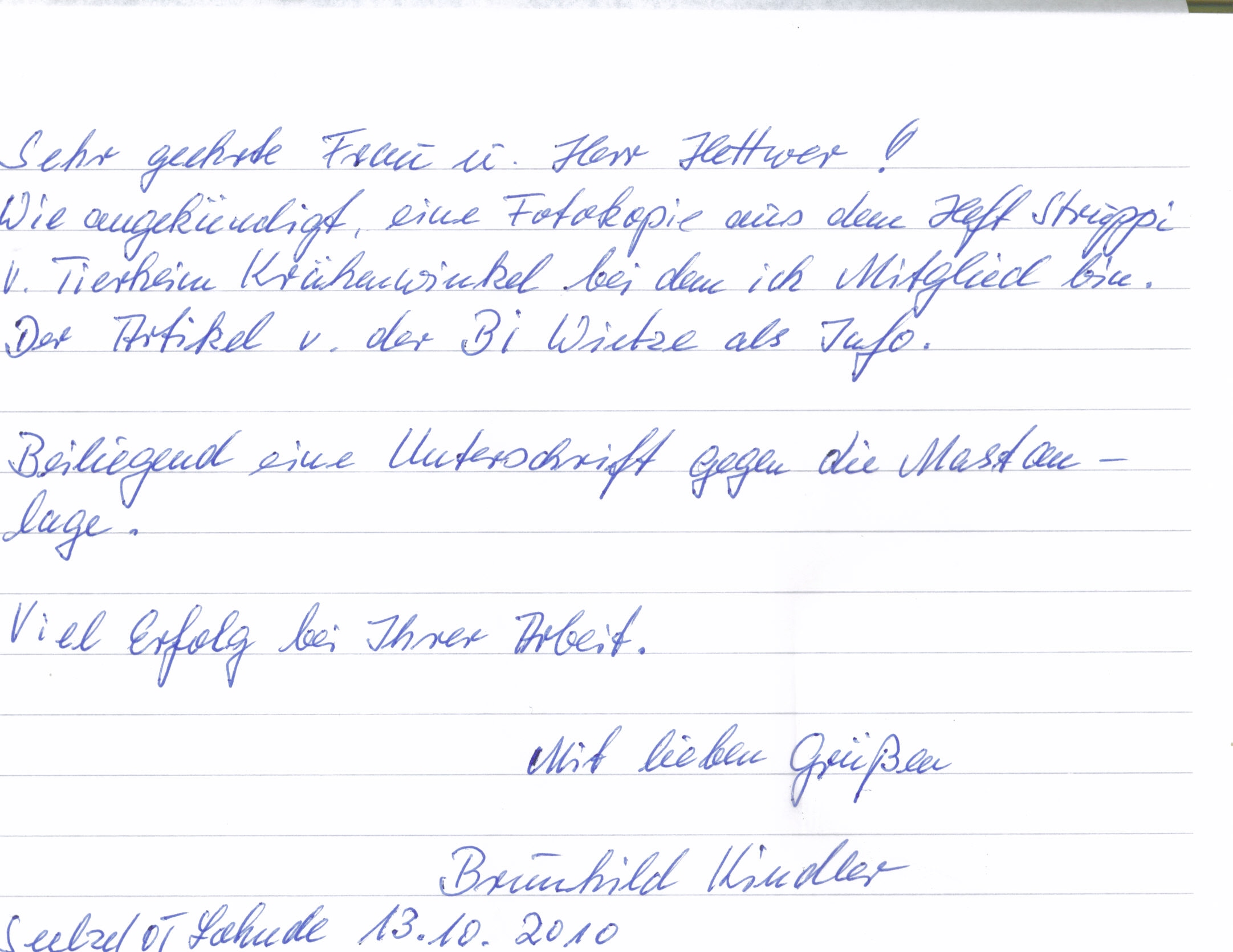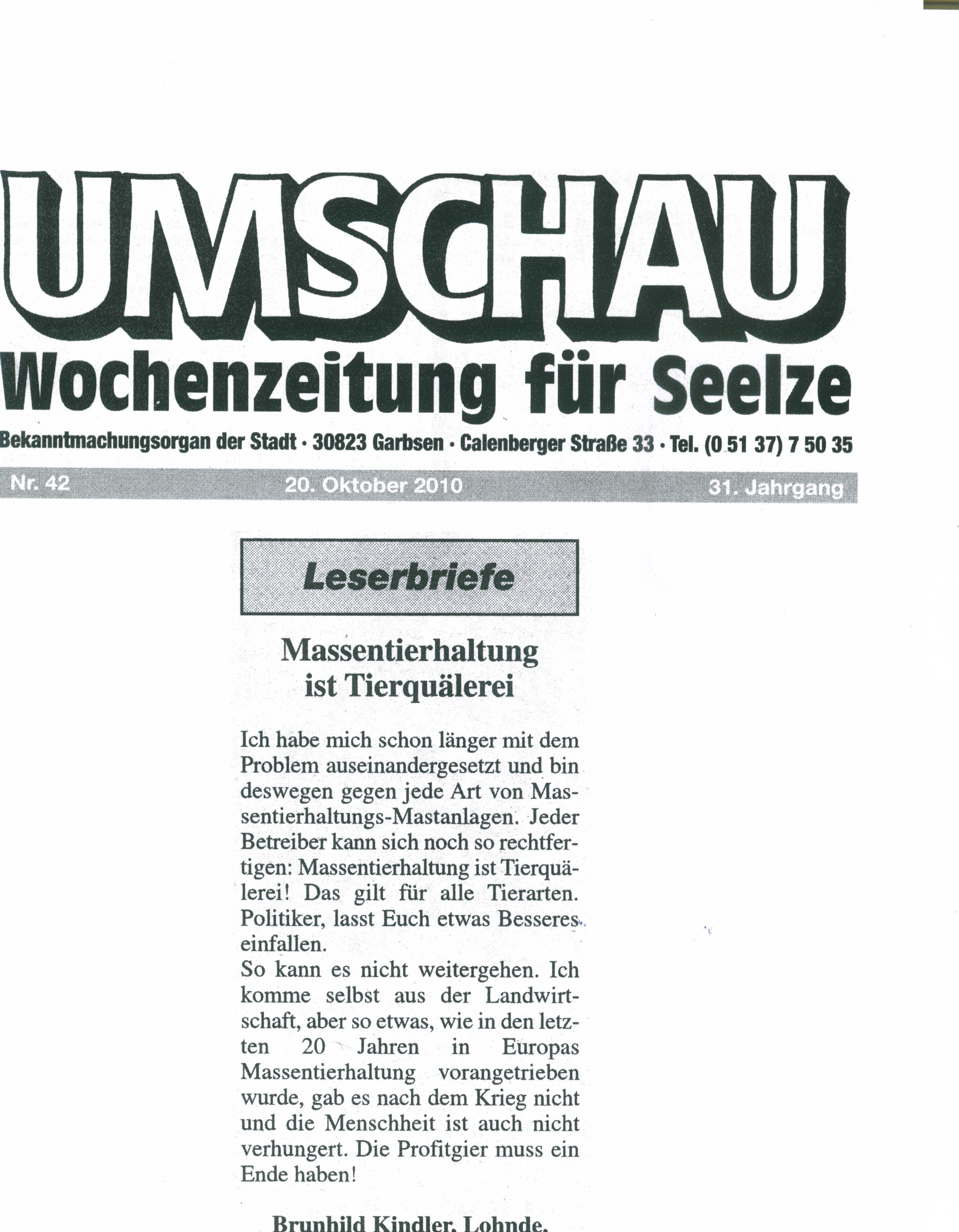 UMSCHAU SEELZE 20.10.2010 LESERBRIEF BRUNDHILD KINDLER