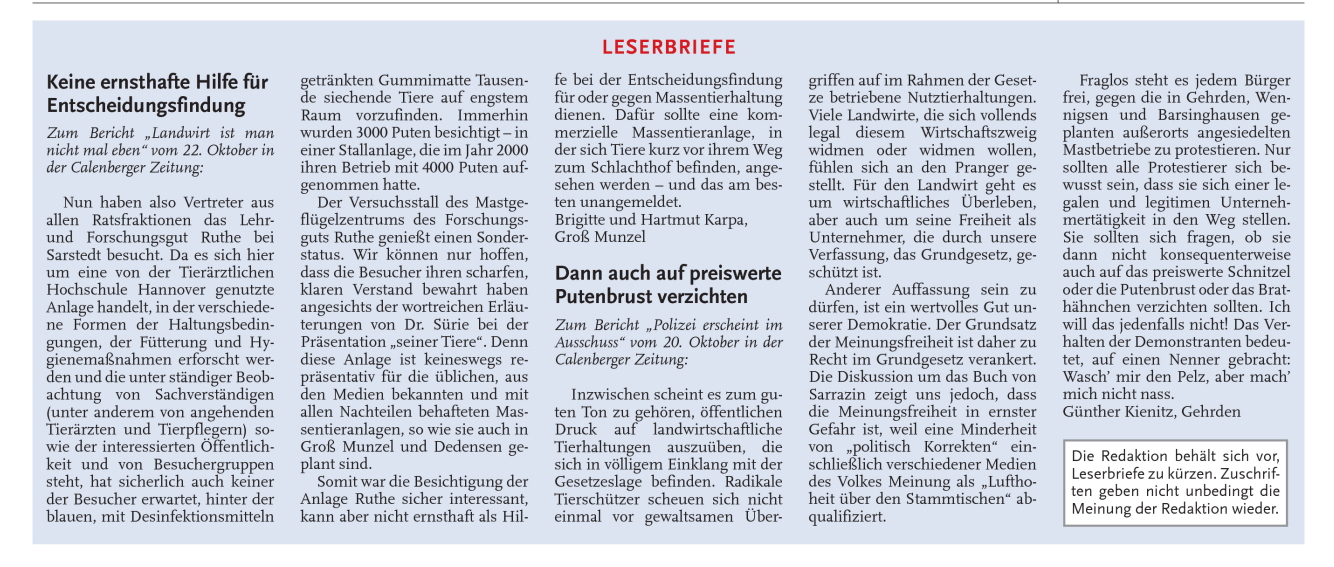 GROSS MUNZEL (ed). In einer Pressemitteilung lädt Landwirt Arnd von Hugo alle Bürger zu einer Besichtigung des Versuchsbetriebes der Tierärztlichen Hochschule in Ruthe ein. Dort werde die praktisch übliche Broilerhaltung gezeigt. Treffpunkt ist am Sonnabend, dem 30. Oktober, um 9 Uhr, an der Volksbank in Groß Munzel. Interessierte melden sich unter ruthe2010@gmx.de an und teilen mit, ob sie ein Auto stellen oder eine Mitfahrgelegenheit suchen. Die Diskussion um die Geflügelhaltung in Groß Munzel werde derzeit intensiv geführt. Während auf der einen Seite die Bürger eine Verschlechterung Ihrer Lebensqualität befürchten, wolle von Hugo mit dem Einstieg in die Veredlung, den Betrieb auf ein weiteres Standbein stellen und den Nährstoffkreislauf seines Betriebes schließen. Der Landwirt möchte die Diskussion versachlichen und Missverständnisse aufklären. Der Versuchsbetrieb in Ruthe biete die Gelegenheit, sich einen Überblick über verschiedene Formen der Tierhaltung – sowie einen Eindruck über das Haltungsverfahren zu verschaffen sowie das Wohlbefinden der Tiere und die Belastung durch Gerüche zu erfahren. Dem Landwirt sei bewusst, dass der Besuch den Vorwurf provozieren würde, der Betrieb in Ruthe sei lediglich ein Lehr- jedoch kein Praxisbetrieb. Allerdings fände die Haltung der Tiere dort unter den üblichen Bedingungen statt. Aus hygienischen Gründen sei die Besichtigung von anderen Nutztierbetrieben mit größeren Besuchergruppen schwierig.