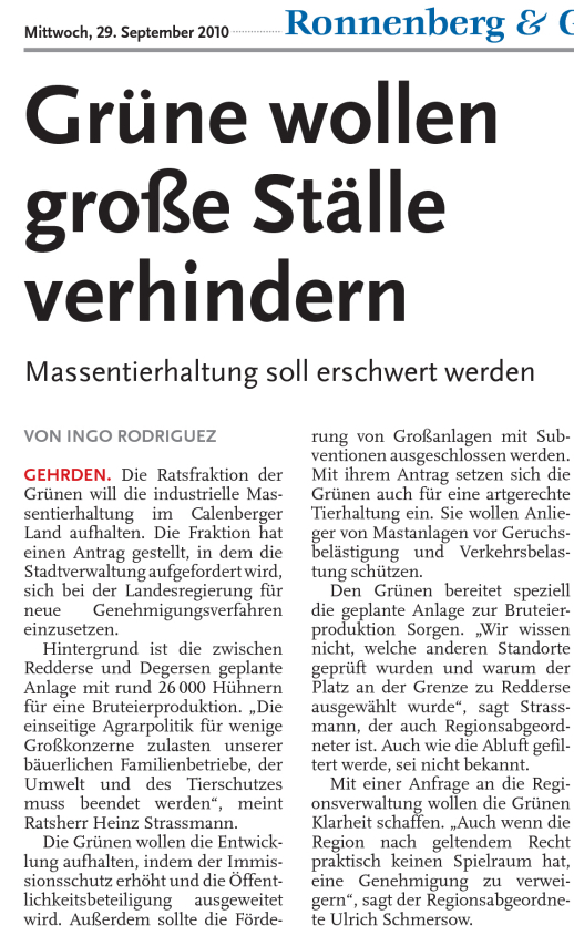 CZ 29.09.2010: GRÜNE WOLLEN GROSSE STÄLLE VERHINDERN