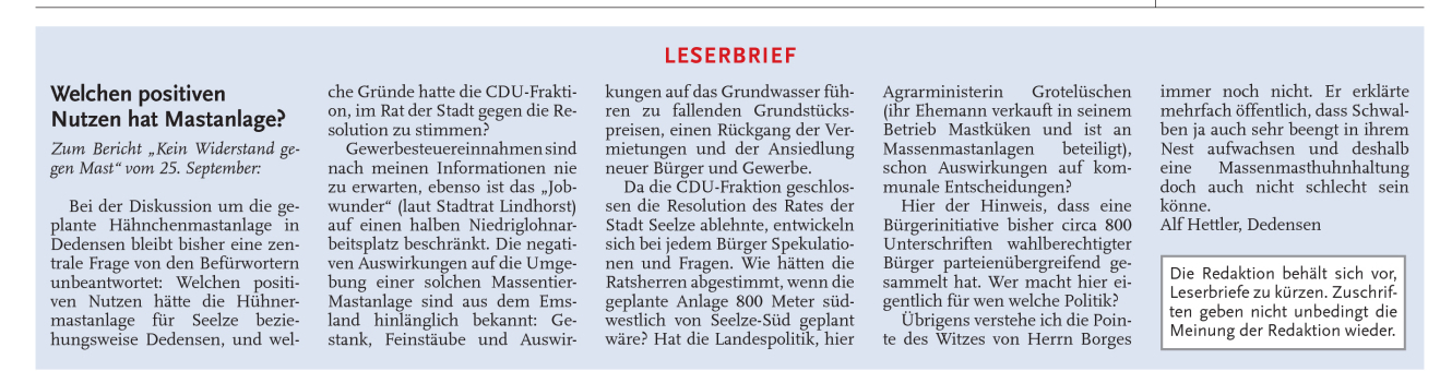 CZ 29.09.2010: LESERBRIEF ALF HETTLER DEDENSEN