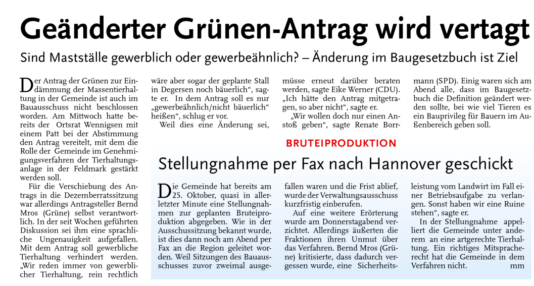 Mit Erstaunen hat die Bürgerinitiative zur Kenntnis nehmen müssen, dass die Ratsmehrheit von CDU/FDP sich am vergangenen Donnerstag für die geplante Mastanlage mit über 84.000 Hähnchen entschieden hat. Michael Hettwer, von der Bürgerinitiative, verweist auf die Aussage von CDU-Parteichef Gerald Schroth während der Sitzung, dass sich die CDU nicht ausreichend mit der Thematik Mastställe beschäftigt habe. Dies sei eine sehr merkwürdige, fast schon skandalöse Argumentation so die Ablehnung zur Resolution zu begründen, so Hettwer. Er habe die CDU bereits am 18. September ausführlich auf die wichtigsten Aspekte aufmerksam gemacht und über die neusten Fakten zusätzlich am 24. Oktober informiert. Man könne doch wohl erwarten, dass sich die Ratsvertreter vorher informieren, wenn sie vor einer Abstimmung stehen. Die wirtschaftlichen Interessen einiger weniger Landwirte scheinen bei der CDU wichtiger zu sein, als der Schutz der Bevölkerung vor Gesundheitsschäden, Wertverlust ihrer Immobilien, Verlust an Lebensqualität und – schon erstaunlich für eine christliche Partei – die ethisch in höchstem Maße widerwärtige Qualzucht der Tiere. Die Bürgerinitiative Munzel wisse jetzt, dass sie und die Bürger in den betroffenen Ortsteilen von der Mehrheitsgruppe im Rat der Stadt Barsinghausen nichts zu erwarten hätten. Das sich die beiden örtlichen Ratsherren gegen die Resolution ausgesprochen haben, obwohl sie sich im Vorfeld nicht über Mastställe informierten und eine reine Klientelpolitik betreiben, werde die Initiative den Wählern verdeutlichen, so Hettwer.