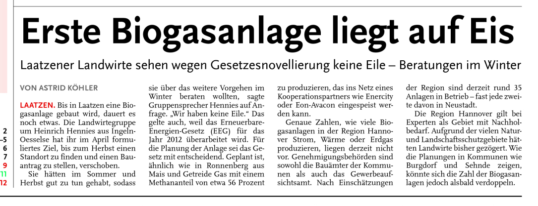 HAZ LZ 18.11.2010 ERSTE BIOGASANLAGE LIEGT AUF EIS