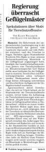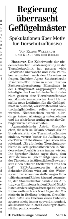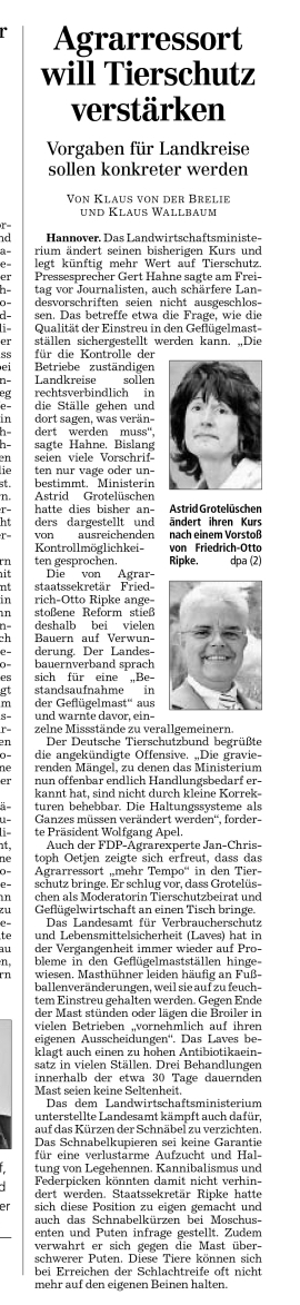 Angesichts wachsender Kritik an der expandierenden Geflügelmast in Niedersachsen will das Land Vorschriften und Kontrollmöglichkeiten verbessern. Das Landwirtschaftsministerium kündigte am Freitag neue Leitlinien für die Geflügelmast an. „Wir müssen die Bestimmungen so konkretisieren, dass die ausführenden Kollegen vor Ort (…) rechtsverbindlich in die Ställe reingehen und sagen können „wir müssen hier etwas ändern““, sagte Ministeriumssprecher Gert Hahne. Friedrich-Otto Ripke (CDU), Staatssekretär im niedersächsischen Agrarministerium, hatte demzufolge am Donnerstag in einer einer internen Sitzung des Landtags-Fachausschusses erstmals gravierende Mängel in der Massentierhaltung eingeräumt. Zugleich kündigte er neue Bestimmungen an. Generell gibt es Hahne zufolge bislang kaum konkrete rechtliche Grundlagen für die Geflügelmast. „Es schwierig überhaupt Parameter zu finden, an denen sich sowas bemisst.“
