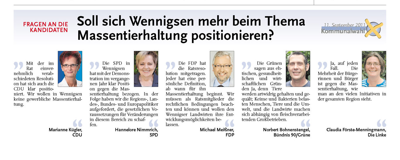 HAZ CZ 25.08.2011 SOLL SICH WENNIGSEN MEHR BEIM THEMA MASSENTIERHALTUNG POSITIONIEREN?