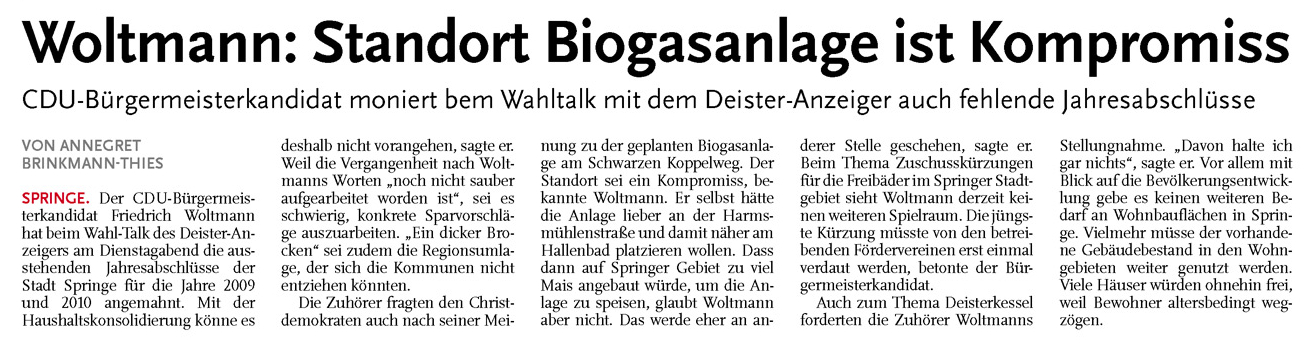 HAZ DA 25.08.2011 WOLTMANN: STANDORT BIOGASANLAGE IST KOMPROMISS