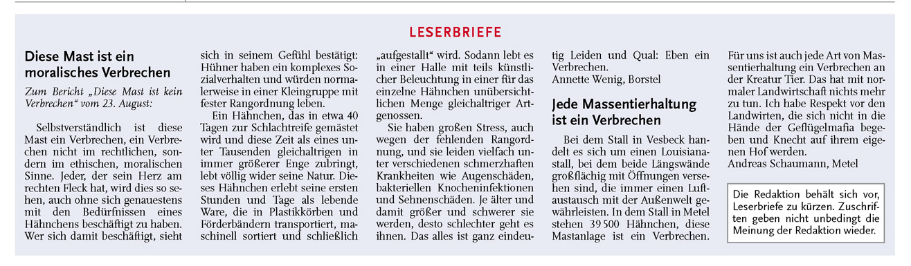 HAZ LZW 26.08.2011 LESERBRIEFE ANNETTE WENIG BORSTEL UND ANDREAS SCHAUMANN METEL