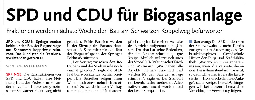 HAZ DA 31.08.2011 SPD UND CDU FÜR BIOGASANLAGE