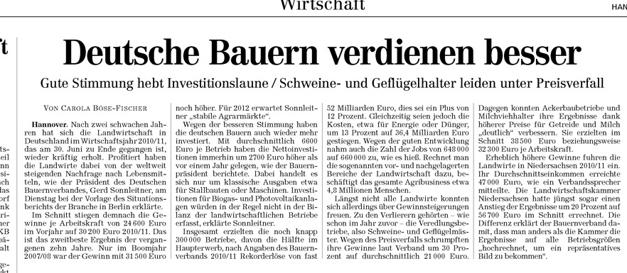 HAZ 14.12.2011 DEUTSCHE BAUERN VERDIENEN BESSER