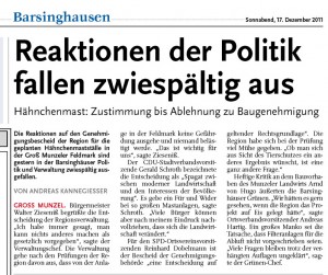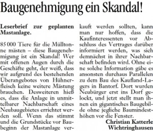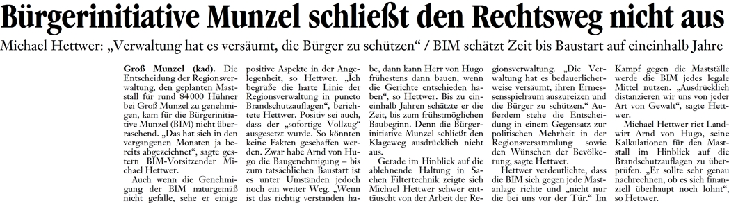 Derzeit gebe es keine rechtlichen Grundlagen, die eine Installation einer Filteranlage für ein solches Projekt vorschreiben, erklärte Axel Priebs, auch nach Rücksprache mit dem Landesgesundheitsamt. Zudem wurde in diesem Punkt bei der Landesregierung angefragt, die Antwort ist bisher allerdings ausgeblieben, sagte Priebs. Sollte sich das Gesetz ändern oder es neue wissenschaftliche Erkenntnisse geben, müsste dann eine entsprechende Nachrüstung mit Filtern erfolgen. Die geplante Hähnchenmastanlage liegt in 700 Meter Entfernung zu Wunstorf-Kolenfeld und 1100 Meter von Groß Munzel entfernt. „Es ist schwer vermittelbar, aber wir sind der Sache gründlich nachgegangen“, erklärte Axel Priebs, der in diesem Punkt auch auf die DIN-Norm 4250 verweist, die zu dem Ergebnis komme, dass es keinen eindeutig nachgewiesenen Bezug zwischen Keimen und einer Gefährdung der Bevölkerung gebe. Antragsteller, der Landwirt Arnd von Hugo begrüßte die Entscheidung der Region. Auf Seiten der Gegner gegen den geplanten Bau zeigte sich der Sprecher der Bürgerinitiative „Calenberger Initiativen“, Michael Hettwer, nicht überrascht über die erteilte Genehmigung: „Ich bedauere, dass die Region nicht den Mut gehabt hat, ihre Ermessensspielräume zu nutzen“, sagte er. In der Region Hannover sind derzeit weitere Großanlagen in Planung: In Wennigsen, Seelze und Springe laufen derzeit noch die Genehmigungsverfahren. Einen sofortigen Beginn der Baumaßnahmen in Groß Munzel hat die Region allerdings abgelehnt. Die erteilte Genehmigung wird nun voraussichtlich am kommenden Donnerstag, dem 22. Dezember, öffentlich für zwei Wochen ausgelegt. Danach besteht einen Monat lang die Möglichkeit des Widerspruchs. Auch die Bürgerinitiative wird die Unterlagen prüfen, erklärte Michael Hettwer. Die Widersprüche haben aufschiebende Wirkung, das heißt mit einem Baubeginn ist frühestens im April zu rechnen. Hinzukommt noch die Möglichkeit des Klageweges bei Ablehnung der Widersprüche. Damit würde sich dann der Baubeginn und der damit einhergehende Einzug der über 84.000 Hähnchen noch weiter nach hinten verschieben. Foto: mh / Archiv