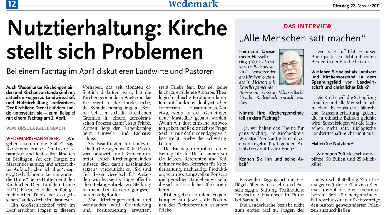 HAZ NHA 22.02.2011 NUTZTIERHALTUNG: KIRCHE STELLT SICH PROBLEMEN