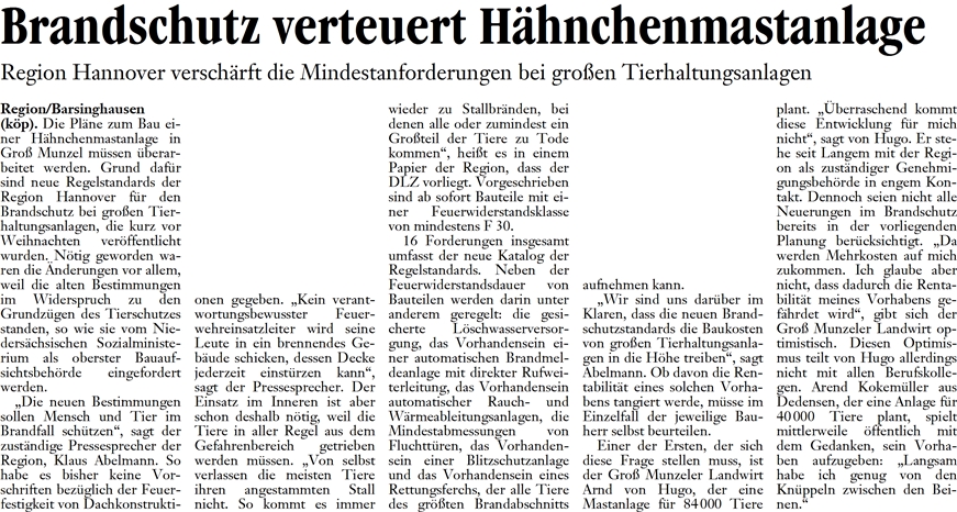 DLZ 07.01.2011 BRANDSCHUTZ VERTEUERT HÄHNCHENMASTANLGE