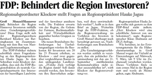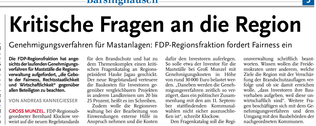 Übrigens: Der Vorsitzende in der Regionsversammlung, Herr Lüddecke, hat am 17.01.2011 telefonisch mitgeteilt, dass sein Fraktionsmitglied zum Thema Brandschutz bei Mastanlagen lediglich seine Privatmeinung kund getan hat und nicht die der FDP-Regionsfraktion.