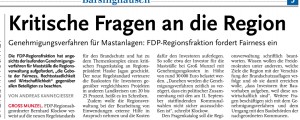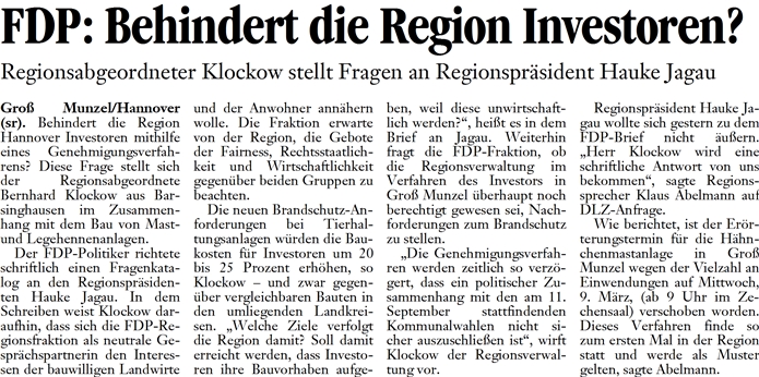 Ich nehme den Presseartikel in der HAZ/Calenberger Zeitung vom 14.01.2011 – der dieser Email beigefügt ist – zum Anlaß, Sie nochmals auf das Thema Massentieranlagen – hier insbesondere in Groß Munzel – zu fragen, ob die FDP-Regionsfraktion nach 4 Monaten in der Lage bzw. Willens ist, die zugesagte Antwort auf unsere Fragen zu geben.