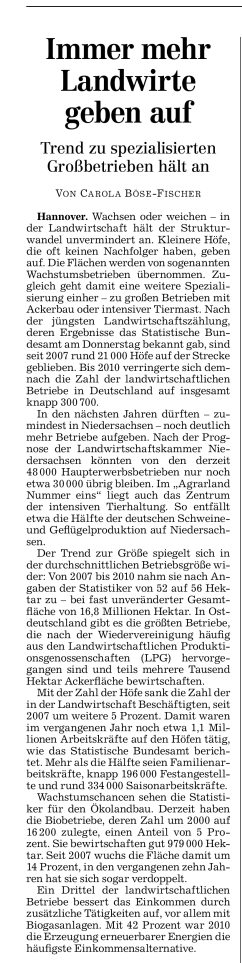 HAZ 28.01.2011 IMMER MEHR LANDWIRTE GEBEN AUF
