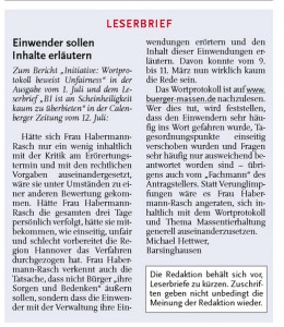 Frau Habermann-Rasch verkennt auch die Tatsache, dass nicht Bürger „ihre Sorgen und Bedenken“ äußern sollen, sondern dass die Einwender mit der Verwaltung ihre Einwendungen erörtern und den Inhalt dieser Einwendungen erläutern. Davon konnte am 09.03. bis 11.03.2011 nun wirklich nicht oder nur kaum die Rede sein.