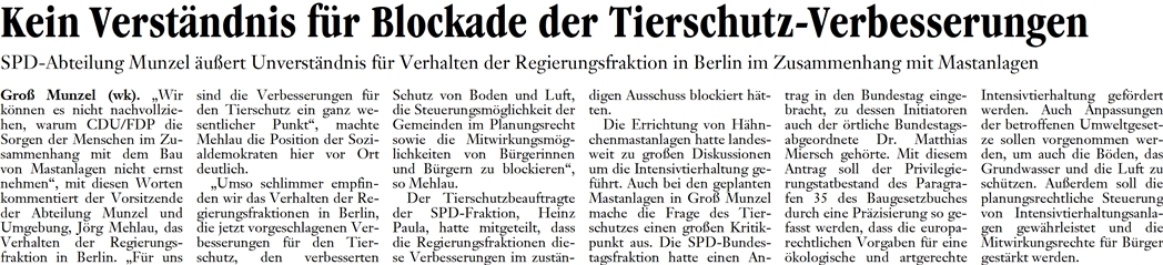 BARSINGHAUSEN (ta). Die Unabhängige WählerGemeinschaft Barsinghausen (UWG) hat sich schriftlich mit einem dringenden Appell an den SPD-Landtagsabgeordneten Heinrich Aller, gewandt. Dieser solle sich bei der Genehmigungsbehörde dafür einsetzen, dass die geplanten Massenmastanlagen in Groß Munzel und Dedensen nicht gebaut werden.