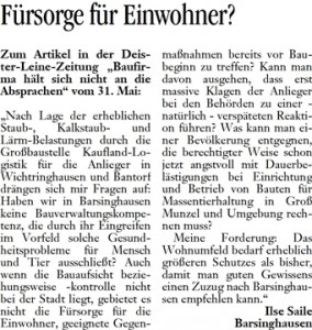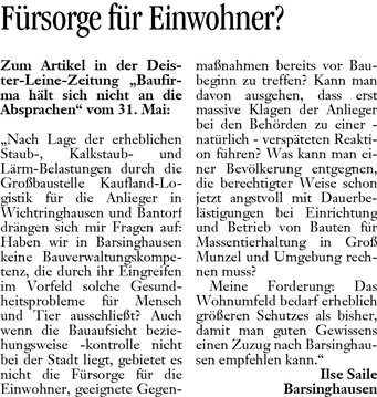 DLZ 03.06.2011 LESERBRIEF ILSE SAILE, BARSINGHAUSEN