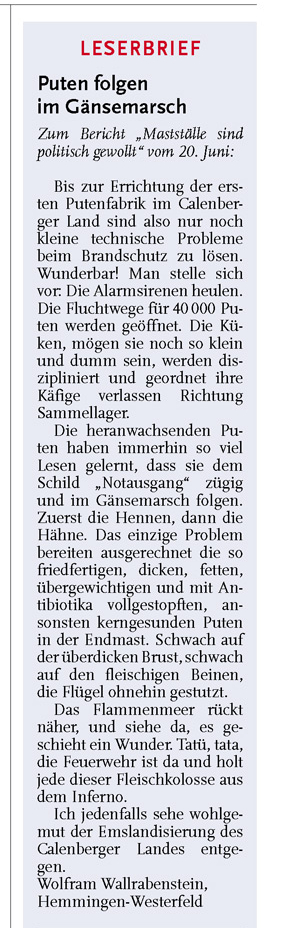 HAZ LN 23.06.2011 LESERBRIEF WOLFRAM WALLRABENSTEIN HEMMINGEN - WESTERFELD