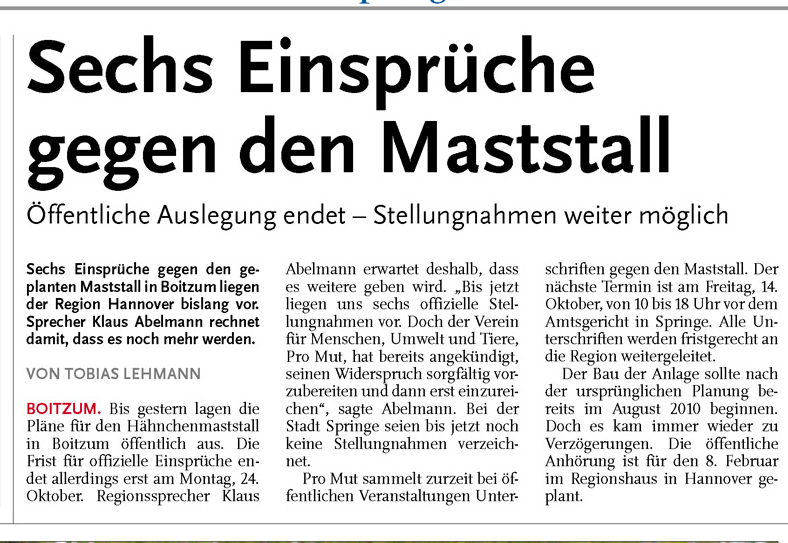 HAZ DA 11.10.2011 SECHS EINSRPÜCHE GEGEN DEN MASTSTALL