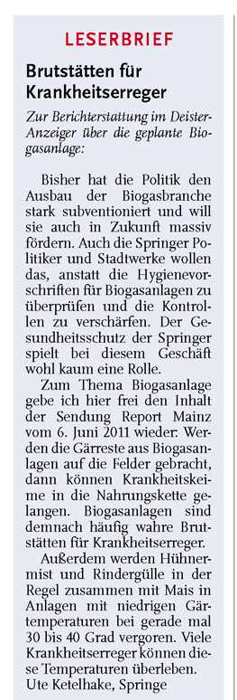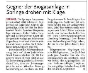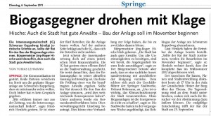 HAZ CZ 06.09.2011 GEGNER DER BIOGASANLAGE IN SPRINGE DROHEN MIT KLAGE