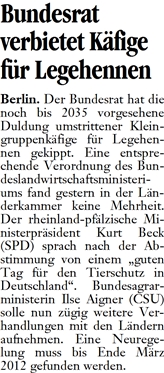 DLZ 24.09.2011 BUNDESRAT VERBIETET KÄFIGE FÜR LEGEHENNEN