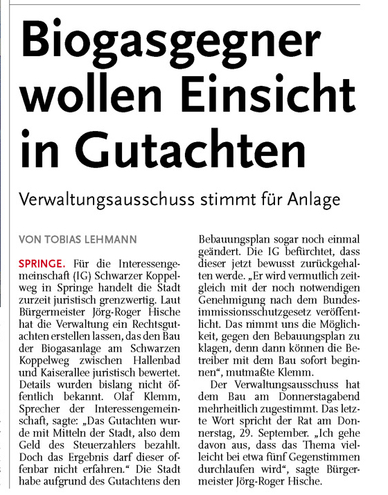 HAZ DA 24.09.2011 BIOGASGEGNER WOLLEN EINSICHT IN GUTACHTEN