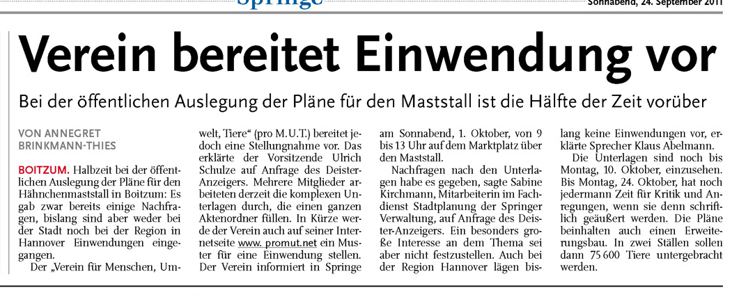 HAZ CZ 24.09.2011 POLIZEI ERWARTET PROTEST GEGEN TIERMAST