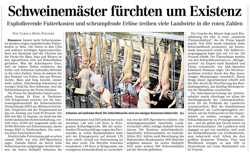 HAZ 16.08.2012 SCHWEINEMÄSTER FÜRCHTEN UM EXISTENZ
