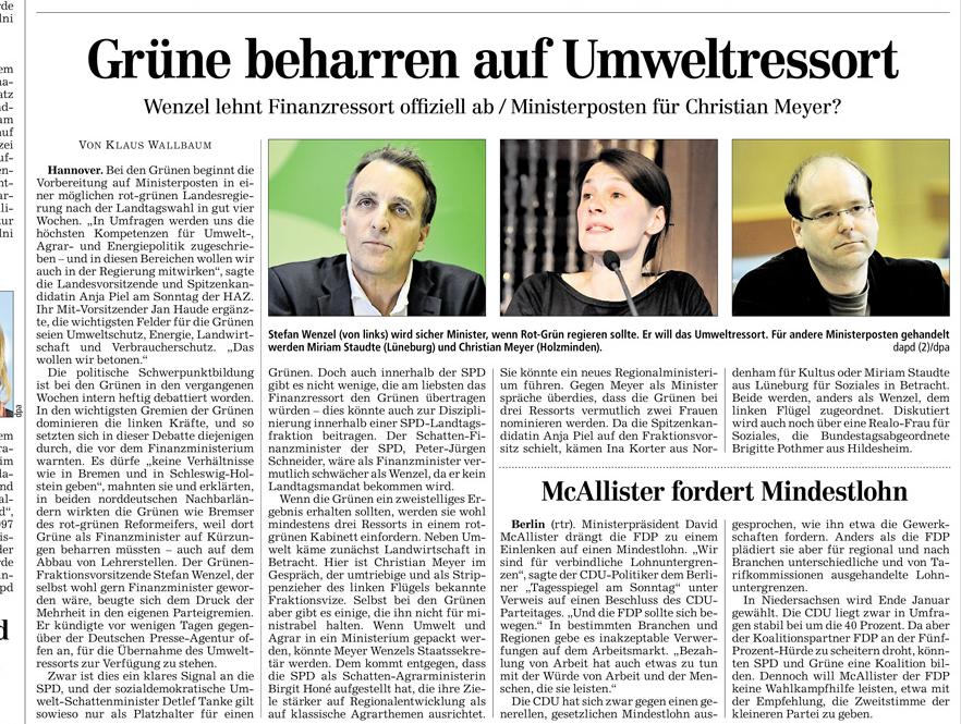 HAZ 17.12.2012 GRÜNE BEHARREN AUF UMWELTRESSORT