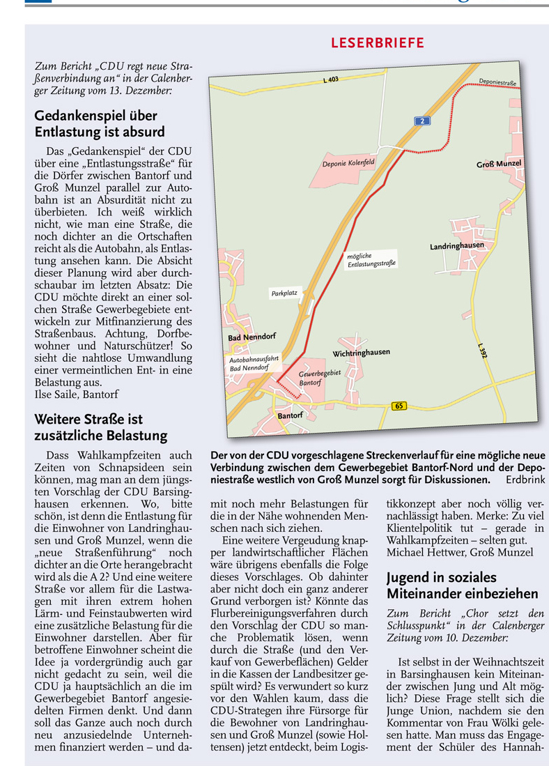 HAZ CZ 17.12.2012 LESERBRIEFE ILSE SAILE, BARSINGHAUSEN UND MICHAEL HETTWER, BARSINGHAUSEN-GROß MUNZEL