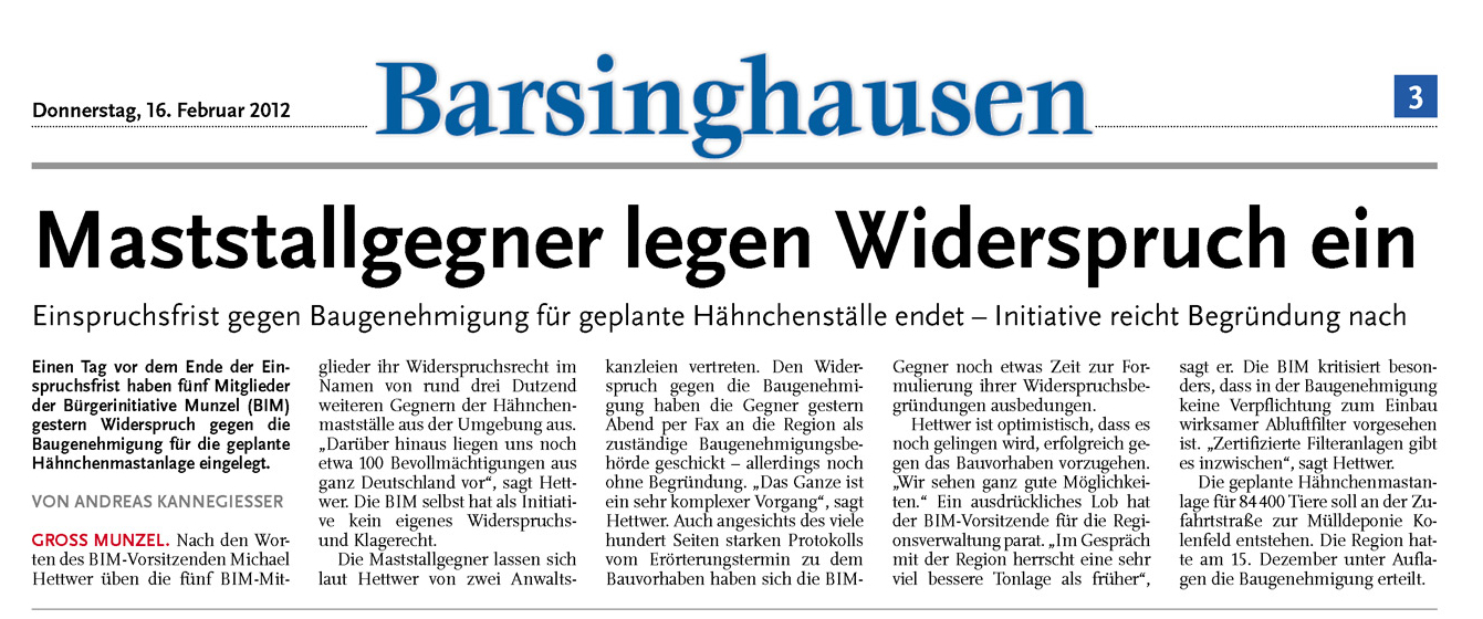 HAZ CZ 16.02.2012 MASTSTALLGEGNER LEGEN WIDERSPRUCH EIN