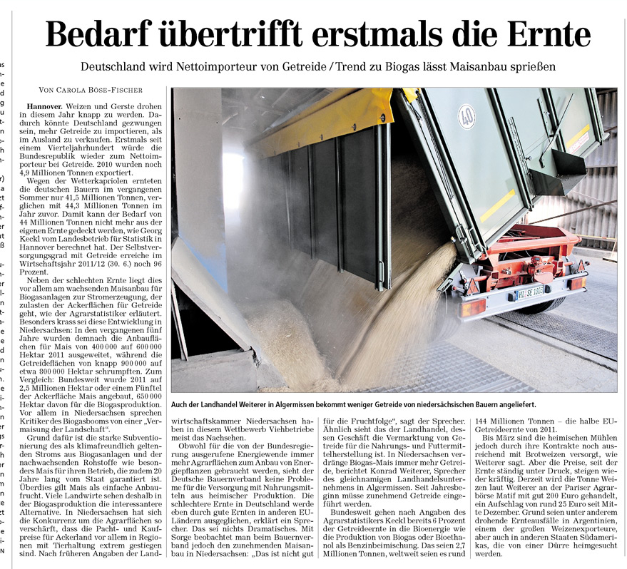 HAZ 16.01.2012 BEDARF ÜBERTRIFFT ERSTMALS DIE ERNTE