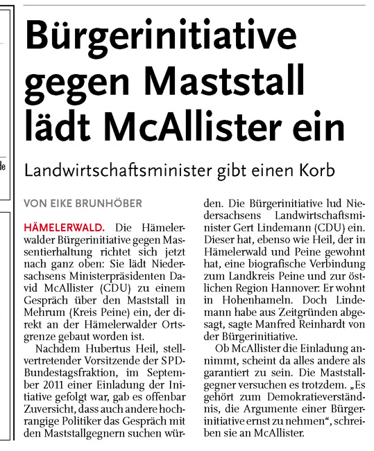 HAZ AB 31.01.2012 BÜRGERINITIATIVE GEGEN MASTSTALL LÄDT MCALLISTER EIN