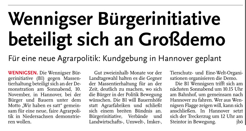 HAZ CZ 03.11.2012 WENNIGSER BÜRGERINITIATIVE BETEILIGT SICH AN GROSSDEMO