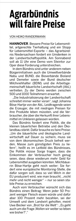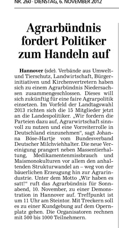 HAZ 06.11.2012 AGRARBÜNDNIS FORDERT POLITIKER ZUM HANDELN AUF