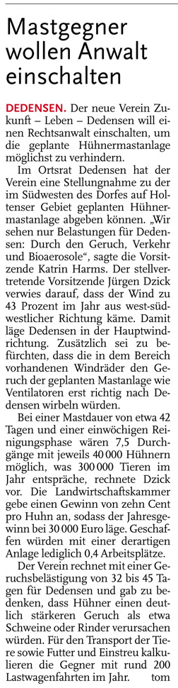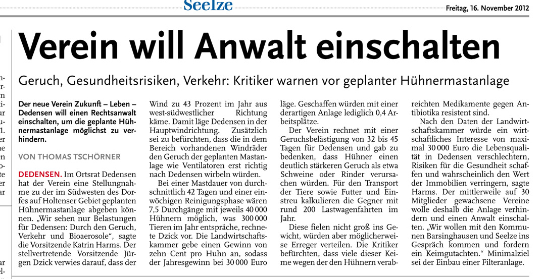 HAZ LZW 16.11.2012 MASTGEGNER WOLLEN ANWALT EINSCHALTEN