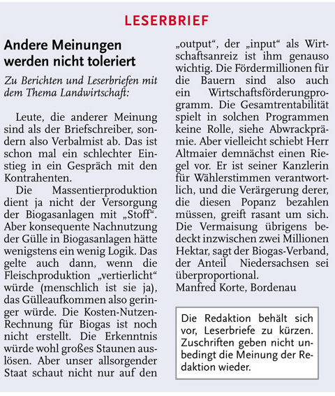 HAZ LZW 19.10.2012 LESERBRIEF MANFRED KORTE, BORDENAU