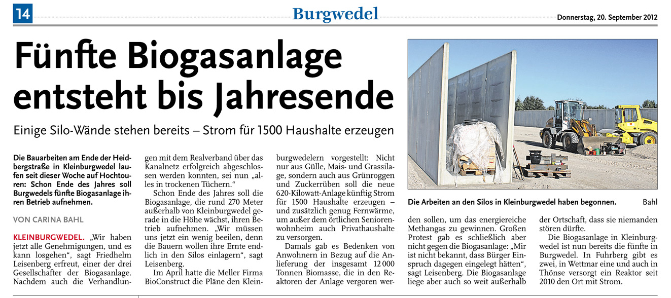 HAZ NHZ 20.09.2012 FÜNFTE BIOGASANLAGE ENTSTEHT BIS JAHRESENDE