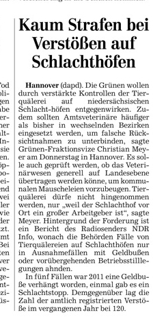 HAZ 21.09.2012 KAUM STRAFEN BEI VERSTÖßEN AUF SCHLACHTHÖFEN