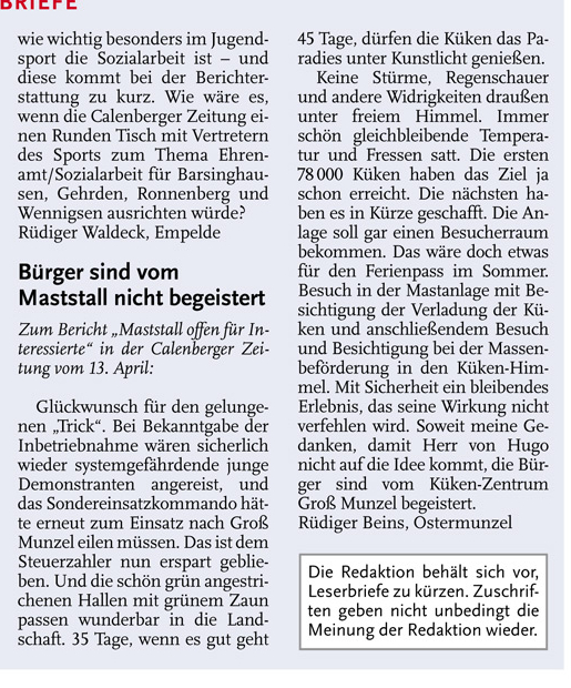 HAZ CZ 25.04.2013 LESERBRIEF RÜDIGER BEINS, OSTERMUNZEL
