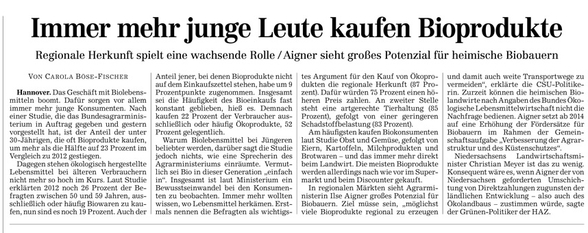 HAZ 20.08.2013 IMMER MEHR JUNGE LEUTE KAUFEN BIOPRODUKTE