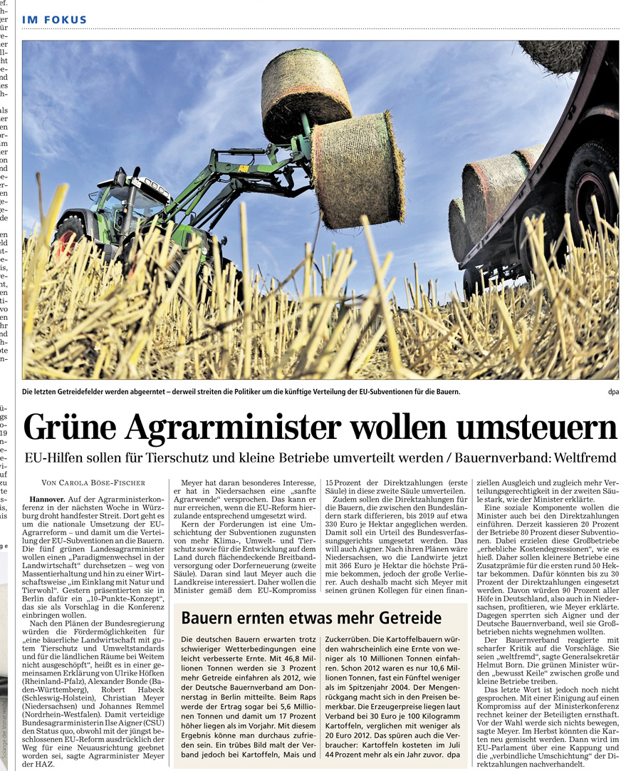 HAZ 23.08.2013 GRÜNE AGRARMINISTER WOLLEN UMSTEUERN