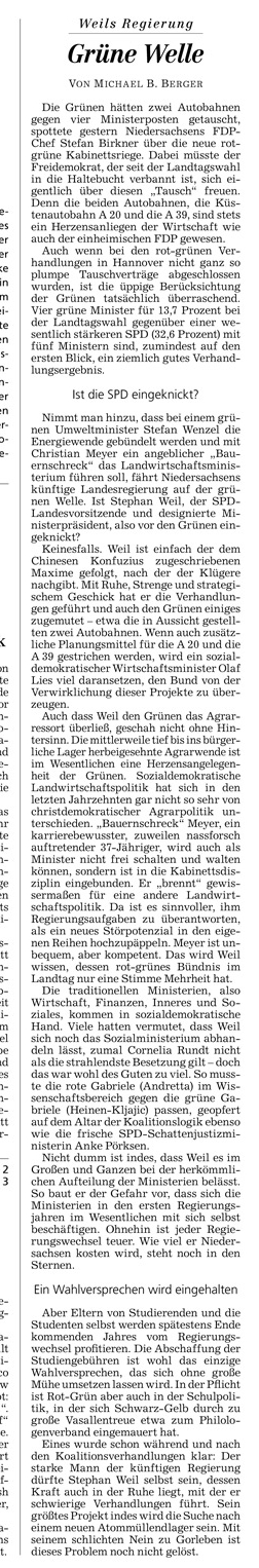 HAZ TITELSEITE 11.02.2013 KOMMENTAR MICHAEL B. BERGER: WEILS REGIERUNG – GRÜNE WELLE