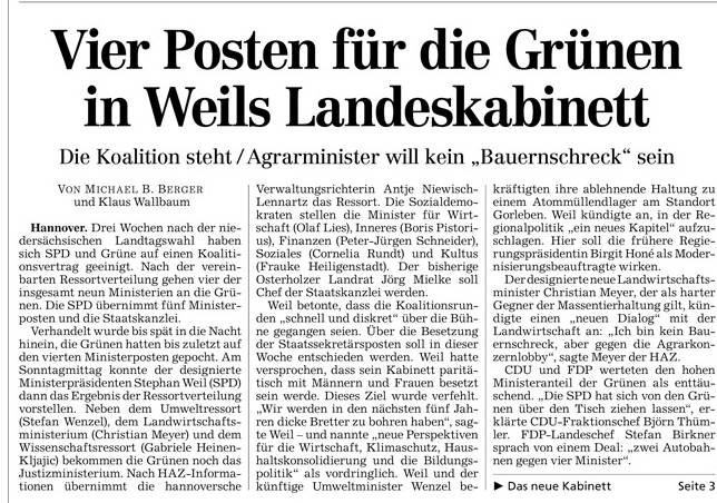 HAZ TITELSEITE 11.02.2013 VIER POSTEN FÜR DIE GRÜNEN IN WEILS LANDESKABINETT