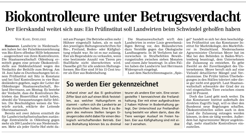 HAZ 02.07.2013 BIOKONTROLLEURE UNTER BETRUGSVERDACHT