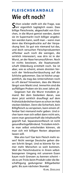 HAZ 26.06.2013 KOMMENTAR KARL DOELEKE: FLEISCHSKANDALE – WIE OFT NOCH?