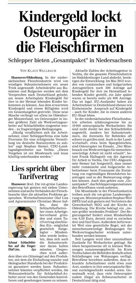 HAZ TITELSEITE 28.06.2013 KINDERGELD LOCKT OSTEUROPÄER IN DIE FLEISCHFIRMEN
