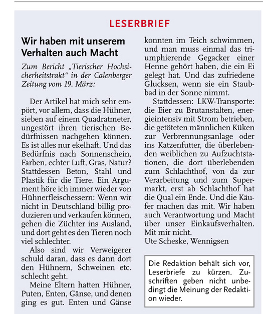 HAZ CZ 04.04.2014 LESERBRIEF UTE SCHESKE, WENNIGSEN
