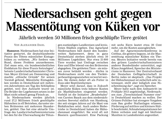 HAZ TITELSEITE 04.04.2014 NIEDERSACHSEN GEHT GEGEN MASSENTÖTUNG VON KÜKEN VOR
