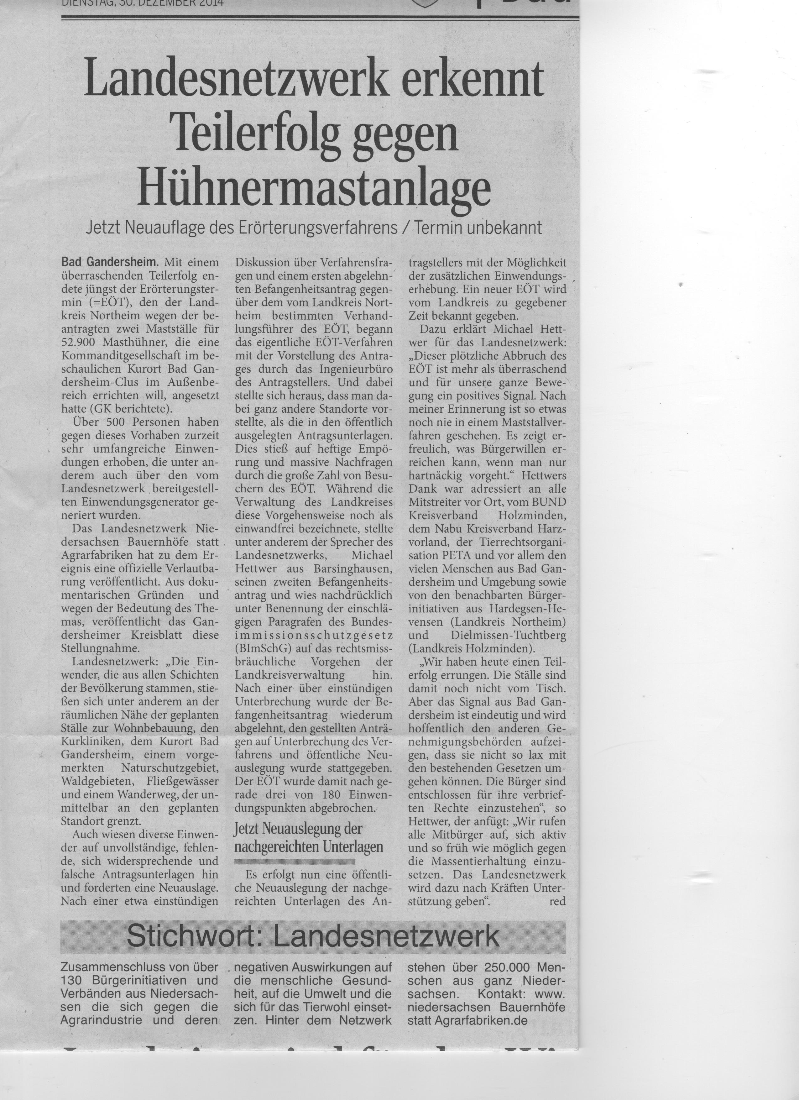 BAD GANDERSHEIMER KREISBLATT 30.12.2014 LANDESNETZWERK ERKENNT TEILERFOLG GEGEN HÜHNERMASTANLAGE